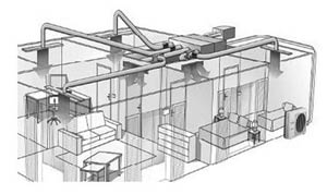 Installations « gainables »Il s’agit ici d’équiper l’ensemble des pieces de la maison et d’assurer une bonne régulation de la temperature intérieure été comme hiver. Pour préserver l’esthetiques des pieces, assurer une diffusion efficace de l’air chaud ou froid dans toute la maison et diminuer le niveau sonore de l’installation, la production d’air est faite par un seul appareil situé dans les combles. Un réseau de gaines isolées diffuse l’air climatisé dans chacune des pieces. |